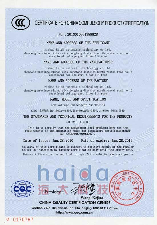 2010年1月28日,我公司獲得低壓配電柜(3C)中國國家強(qiáng)制性產(chǎn)品認(rèn)證證書。